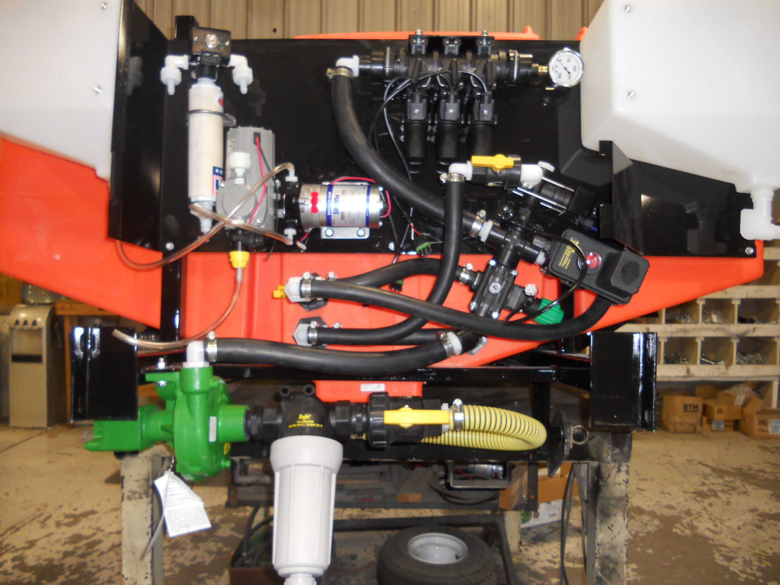 The tank is a low-profile 200 gallon poly with an oversized sump and dual inductor agitation nozzles, that provide excellent mixing action, yet allow complete drainage of the tank. Its corner-fill well with splash guard provides greater safety because the operator does not have to reach over the sprayer when filling with chemicals or water.